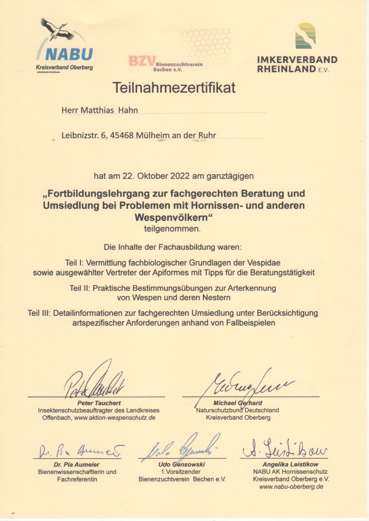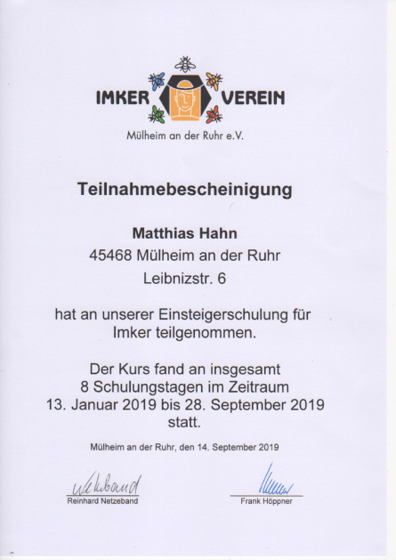 Das Thema "Bienen" ist komplex. Daher habe ich einen Imker-Kurs im Imkerverein Mülheim-Ruhr e. V. gemacht. Neben Weiterbildung ist der regelmäßge Austausch mit Imker-Freunden wichtig. Man lernt eine Menge in so einer Einsteiger-Schulung. Jedoch ist die tägliche Imkerpraxis immer wieder von neuem aufregend. Hier kann man dann das Gelernte anwenden. Aber wie heißt es so schön: "Viele Wege führen nach Rom." oder "Zwei Imker - drei Meinungen".